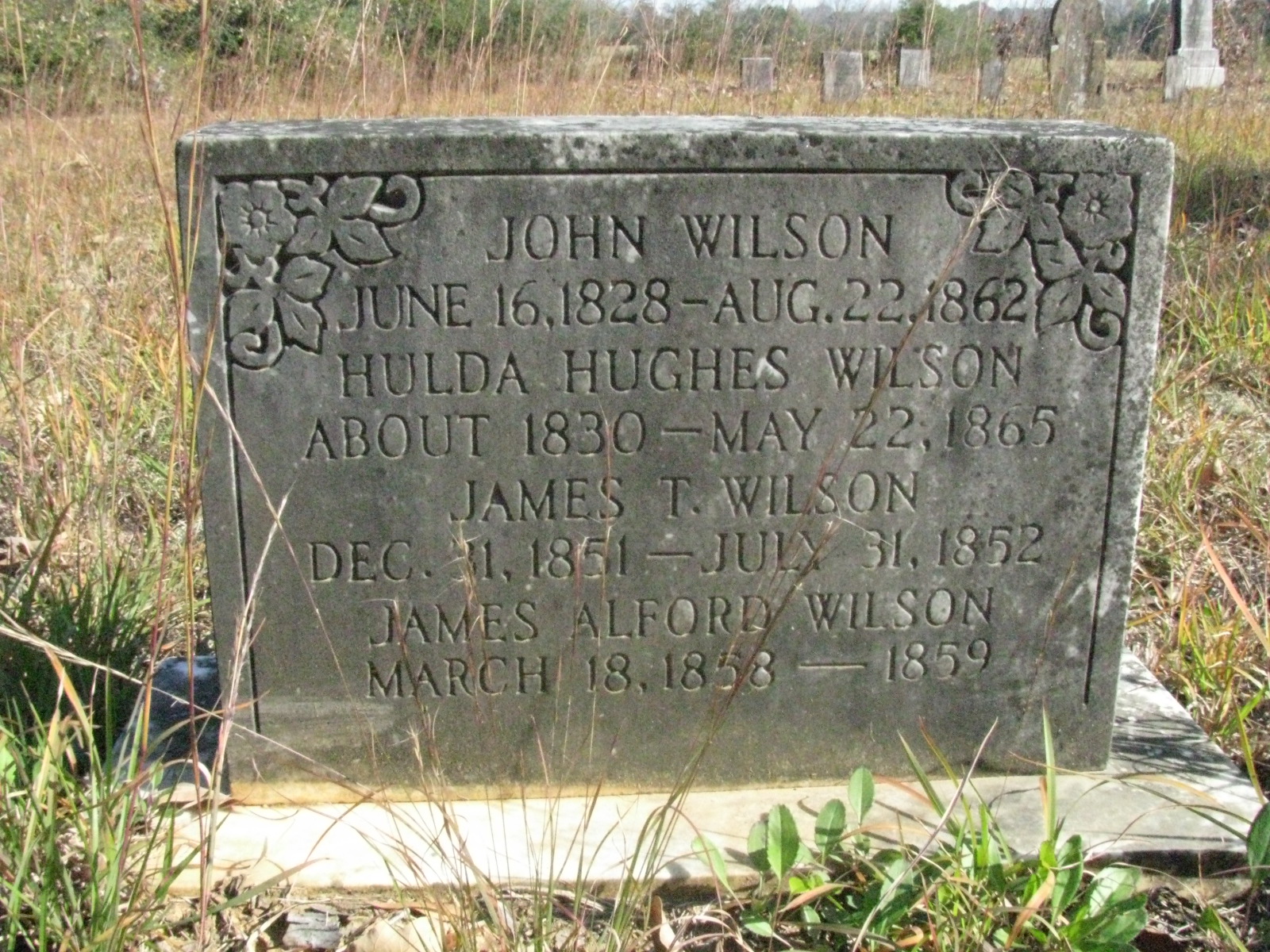 Hulda Hughes Wilson (1833-1865) was a sister of Thomps Hughes. She married John Wilson (1828-1862), who was her first cousin.