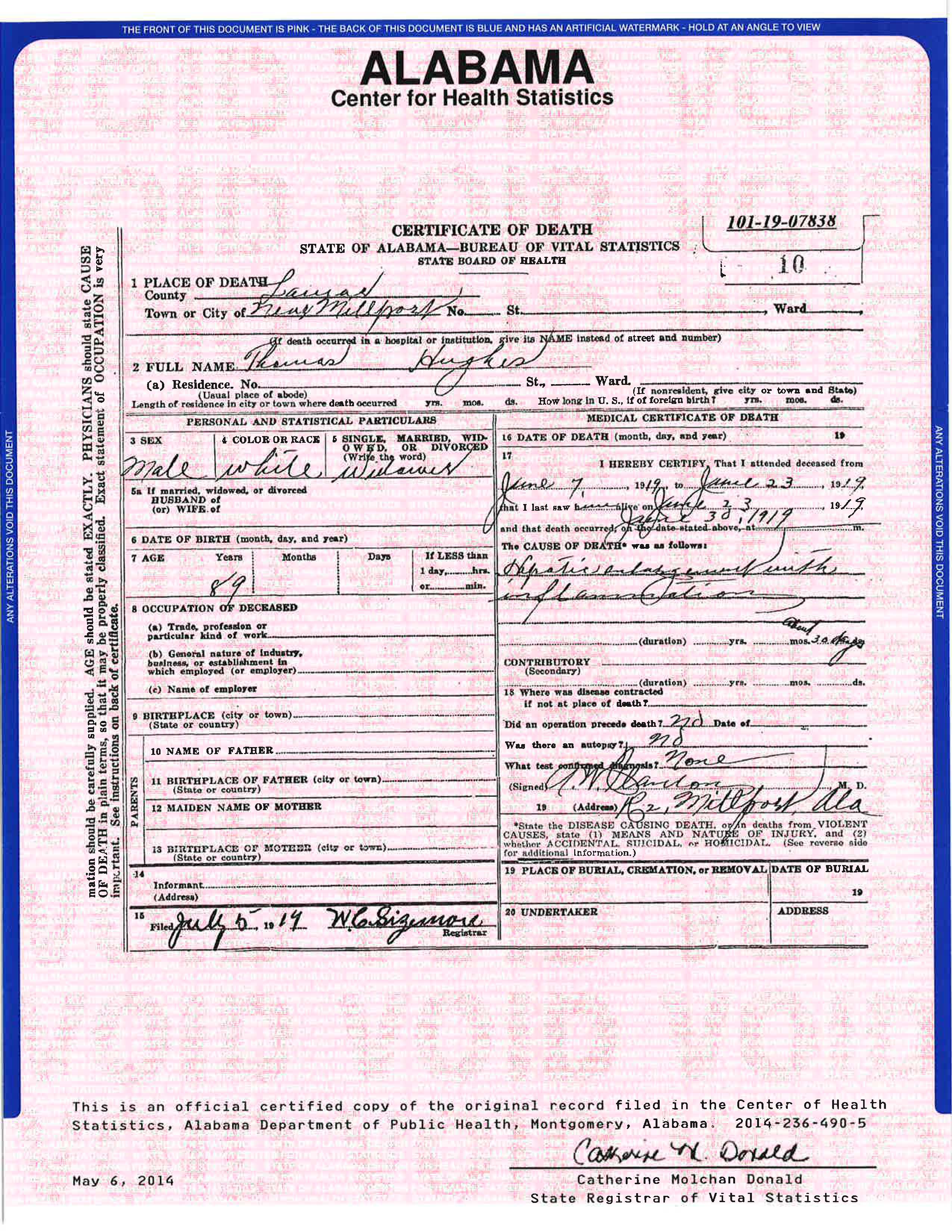 UPDATE (posted Wednesday, Oct. 1, 2014):  I am way overdue in posting this, but I am happy to report that the Alabama Department of Public Health has amended this death certificate as I requested.