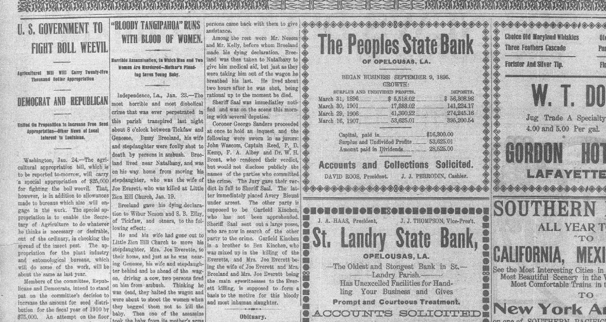 Independence, La., Jan. 23.–The most horrible and most diabolical crime that was ever perpetrated in this parish transpired last night about 8 o’clock between Tickfaw and Genesee. Buzzy Breeland, his wife and stepdaughter were foully shot to death by persons in ambush. Breeland lived near Natalbany, and was on his way home from moving his wife and stepdaughter, who was the wife of Joe Everett, who was killed at Little Zion Church Jan. 19.